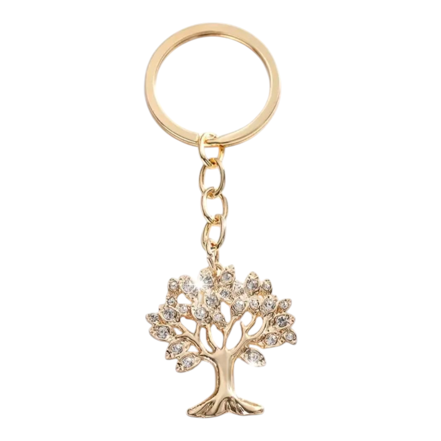Nøkkelring med Livets tre i gull og glitrende klare rhinestones, stilfull legeringsnøkkelring for kvinner, perfekt gave til bursdager eller veskedekorasjon